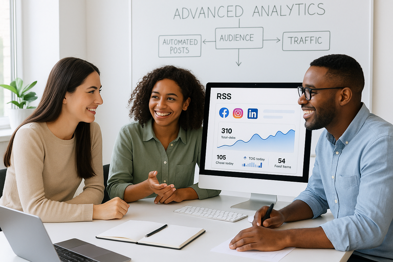 Conecte seus feeds (blog, notícias, podcasts, YouTube) e transforme novidades em posts sociais de forma automática.